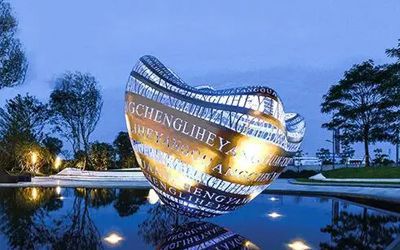 地產類不銹鋼雕塑以大氣磅礴為主要表現形式,一般都是抽象的,傳遞一種視覺上的震撼效果,常見如圓環、鏤空球、云朵、假山、浪花、水滴等等。